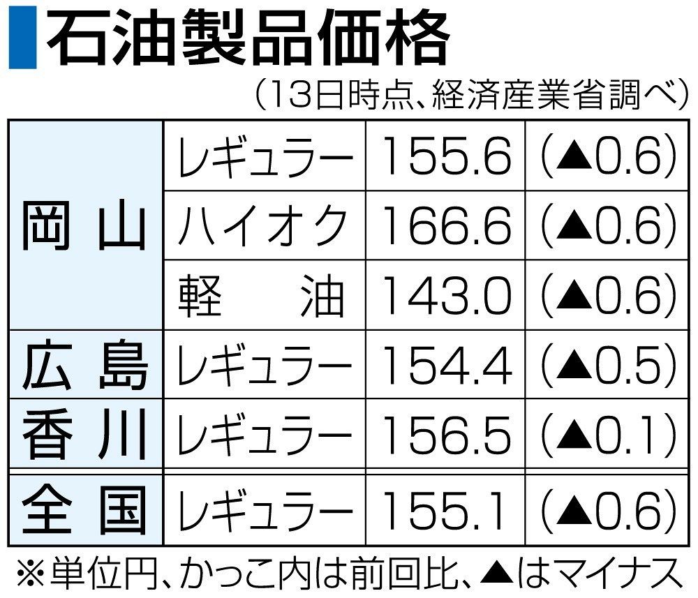 経済産業省が15日発表した13日時点のレギュラーガソリン1リットル当たりの秋田県の平均小売価格は、前週調査より40銭高い155円70銭で、11週ぶりに値上がりした。